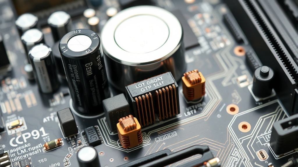 Motherboard detail showing PCIe slot area with various capacitors and power delivery components clearly visible