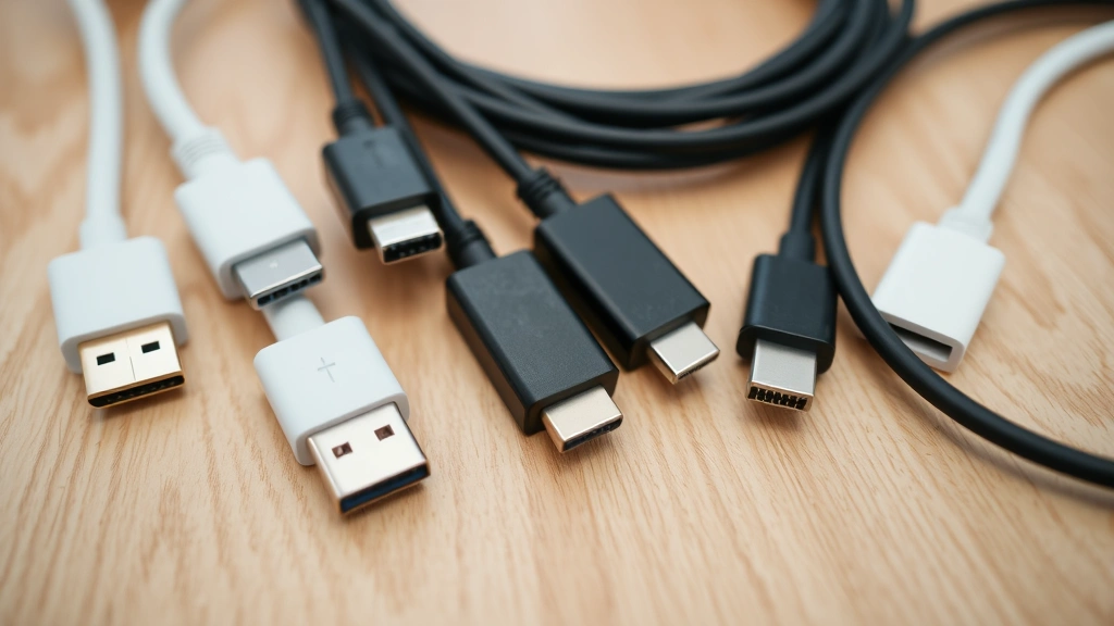Close-up of various laptop video ports and cables laid out on a surface